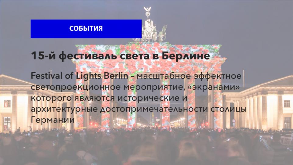 Festival of Lights Berlin – масштабное эффектное светопроекционное мероприятие, «экранами» которого являются исторические и архитектурные достопримечательности столицы Германии. Фестиваль проводится с 2005 года и неизменно в течение 10 дней привлекает сотни тысяч горожан, гостей и туристов.