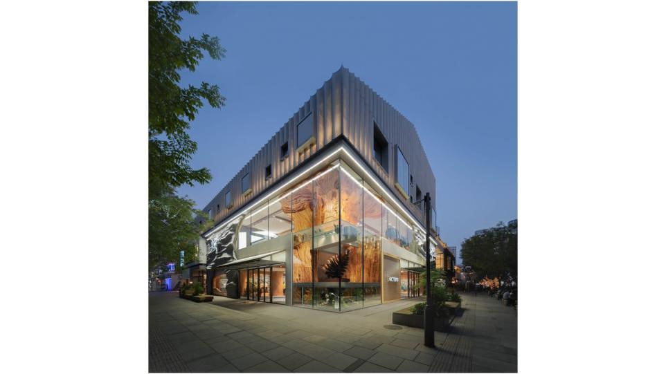 В этом двухэтажном магазине первый этаж спроектирован как выделенная зона для профессионального скалолазания и пешего туризма — зона, подходящая для сценариев горной и лесной тематики. Между тем, второй этаж будет отведен под зону городской жизни для показа 24 Collection, серии VEILANCE и сессий по обмену горными навыками в магазинах. По всему пространству элементы камня, деревьев и древесины интегрированы в горный фон, выражая ДНК бренда ARC'TERYX. Сочетание окружающего освещения и местного освещения продуктов помогает создать разную атмосферу в разных помещениях за счет взаимодействия теплых и холодных тонов.