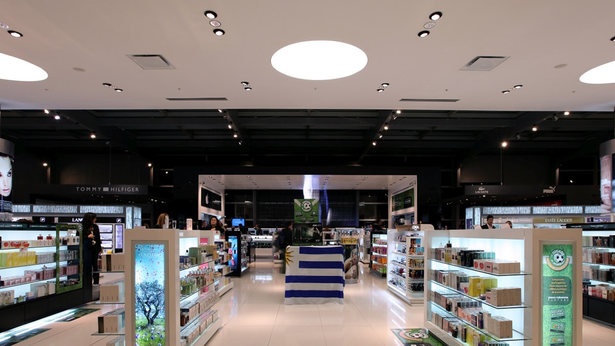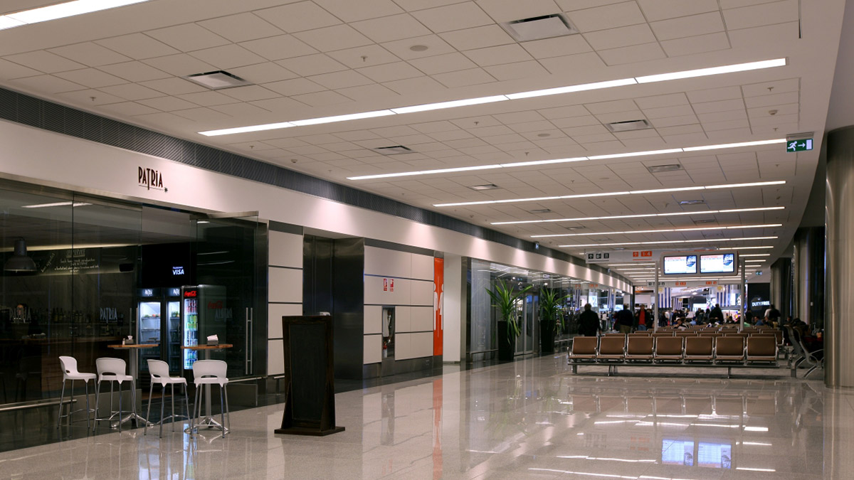 Для освещения торговых зон с магазинами Duty Free и бистро использованы встроенные в потолок светодиодные светильники downlight из серий Reflex и Frame, а также встроенные осветительные приборы с металлогалогенными лампами 35, 70 и 150 Вт (в зависимости от высоты установки).
