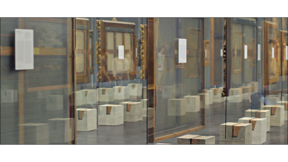 Вертикальные стеклянные панели надёжно крепятся в пазах бетонных блоков с помощью дубовых клиньев. От механического воздействия (в том числе и от нарочитого повреждения) картины защищены панелями из оптически чистого (бесцветного) поликарбоната.
