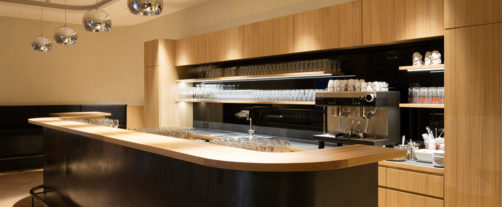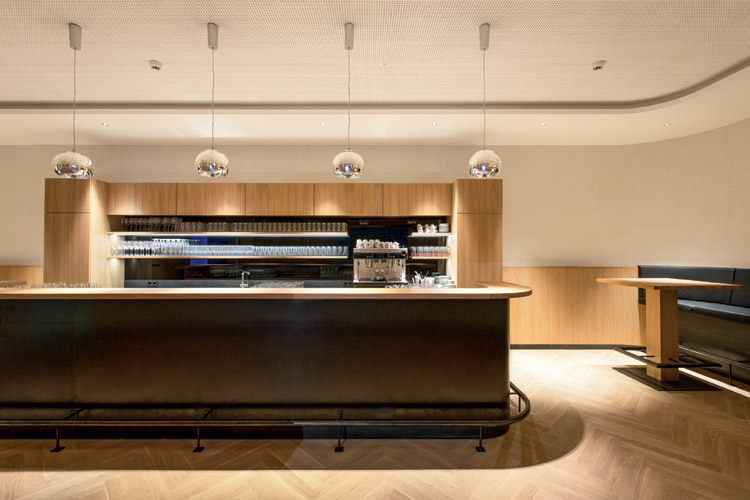 Над стойкой бара подвешены сферические светильники SCONFINE с зеркальной наружной поверхностью, автор этой модели – знаменитый итальянский архитектор по интерьеру Маттео Тун (Matteo Thun).