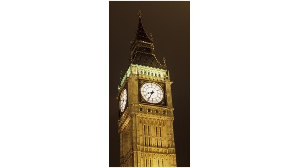 Высота башни «Биг-Бен» со шпилем - 96,3 м. Диаметр циферблата часов — 6,9 м, длина стрелок — 2,7 и 4,2 м.