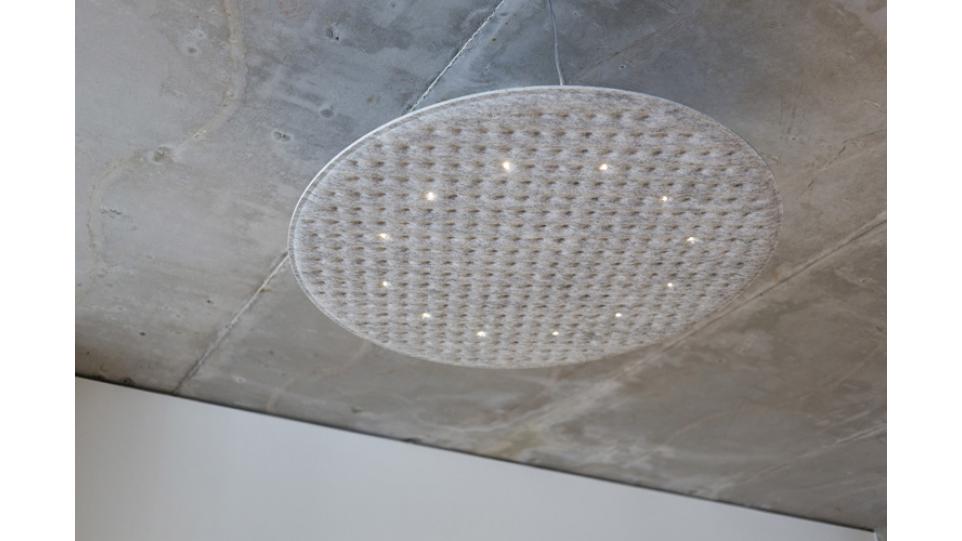 В помещениях создан как осветительный, так и акустический комфорт за счет применения подвесных «дисковых» светильников «Lighting Pad R 900».