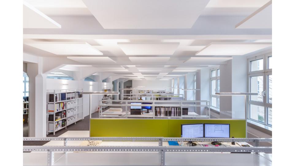 Штутгартская компания Nimbus Group разработала проект освещения рабочих офисов с применением своих энергосберегающих светильников. В том числе, были использованы специальные типы осветительных приборов со звукопоглощающими поверхностями, а также шумогасящие перегородки между смежными рабочими зонами.