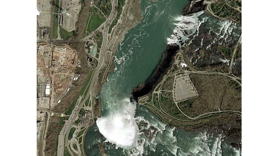 Снимок местности панорамы водопадов сделан со смотровой башни «Skylon Tower» высотой 160 м, возведённой в 1965 году в канадском Ниагара-Фолс.