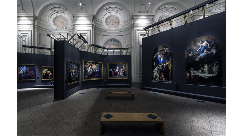 Экспозиция выставки Sfida al Barocco размещена в огромном зале галереи Citroniera Juvarriana дворца La Venaria Reale в Турине.