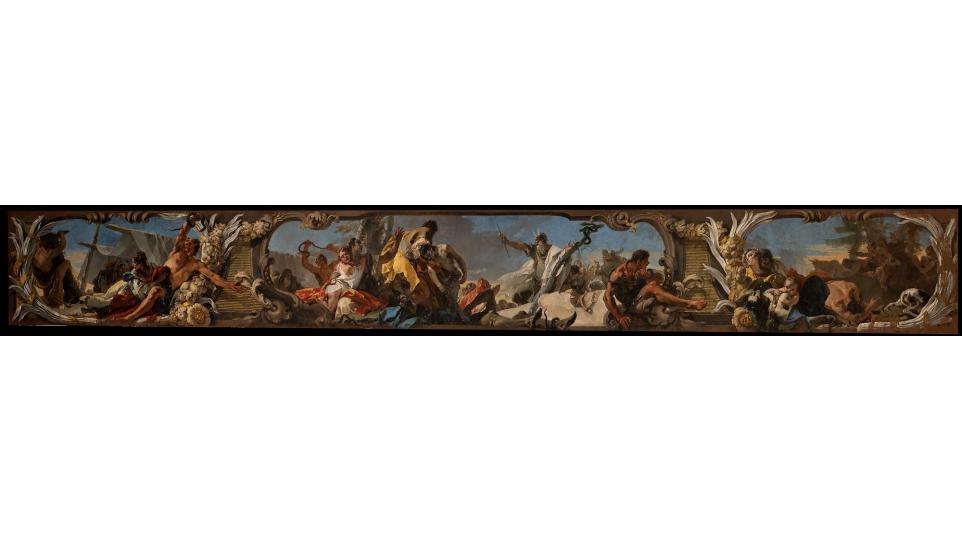 На полотне представлены три эпизода, каждый из которых обрамлен орнаментальными мотивами, имитирующими разные материалы: позолоченное или лакированное дерево и лепнину с великолепными узорами XVIII века.