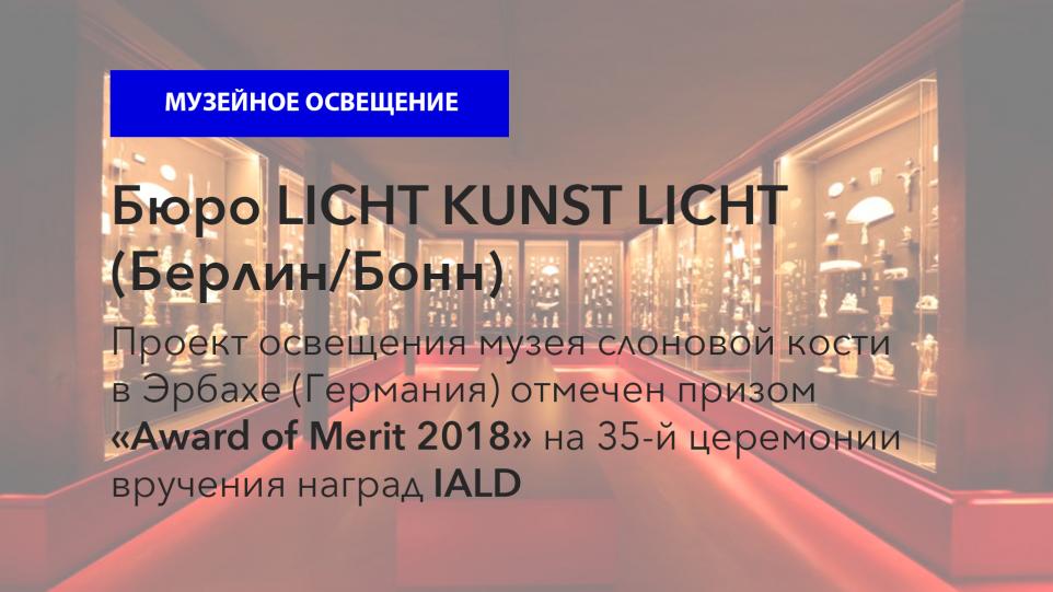 Проект освещения музея слоновой кости в Эрбахе (Германия) отмечен призом «Award of Merit 2018» на 35-й церемонии вручения наград IALD- Международной ассоциации светодизайнеров (Чикаго, 9 мая 2019 года).