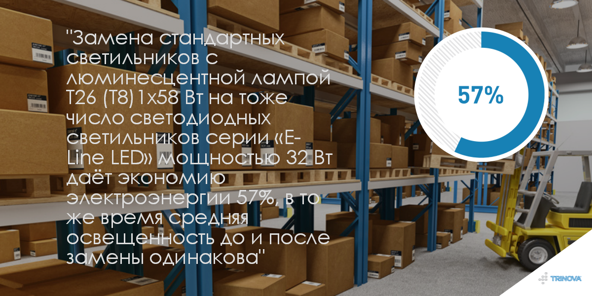 Средний уровень горизонтальной освещенности примерно 500 лк после замены старых светильников остался неизменным. Установленная мощность светильников после модернизации уменьшается в 2,34 раза.