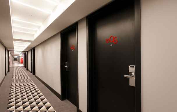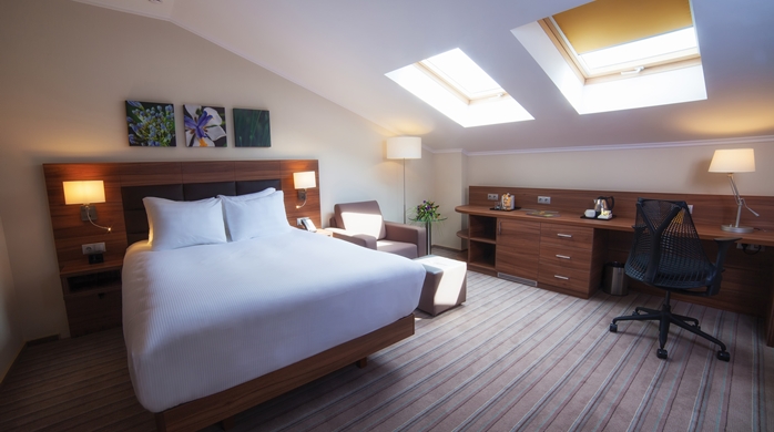Освещение в гостиничных номерах, как правило, представляет собой комбинированную систему общего и специального освещения. Общее освещение может быть реализовано при помощи встраиваемых светильников типа downlight по периметру комнаты. В отдельных случаях, с помощью накладных или подвесных светильников, располагающихся по центру комнаты. Освещение номеров современных отелей реализовано по принципу разумной достаточности. Прежде всего, хороший уровень освещенности создается при входе в номер - в коридоре. Освещение этой зоны номера может быть реализовано при помощи встроенных компактных даунлайтов, в отдельных случаях при помощи потолочных светильников. Главная задача – обеспечить безопасный вход, безопасное размещение багажа и возможность перемещения в следующую зону. Особое внимание уделяется освещению ванной комнаты/санузла. Здесь необходимо обеспечить высокий уровень освещенности для простой и безопасной навигации и эксплуатации помещения. Для решения этой задачи используются также встроенные или накладные светильники с высокой степенью влагозащиты IP44 для влажных помещений. Дополнительно подсвечивается зона зеркала, либо используются зеркала со встроенной подсветкой. Сам номер, как правило, освещается неравномерно, это связано с четким зонированием помещения.