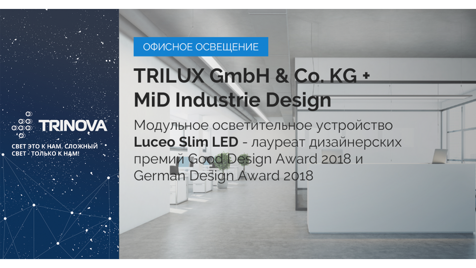 Luceo Slim LED (разработчик - MiD Industrie Design) - подвесные и потолочные светильники общего освещения (для офисных и учебных зданий) обеспечивают высокий зрительный комфорт и экономию электроэнергии более 60% (по сравнению с системами освещения на базе светильников с люминесцентными лампами типа Т26 (Т8) и Т16 (Т5).