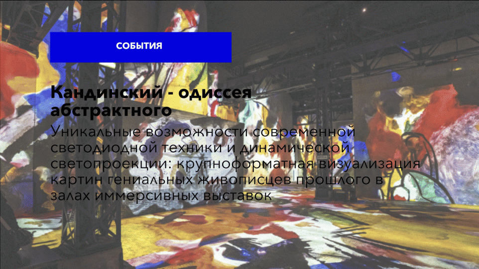 В парижском центре цифрового искусства (l'Atelier des Lumieres) проводится иммерсивная выставка "Kandinsky, l'odyssee de l'abstrait" («Кандинский - одиссея абстрактного» (18 .02 2022 - 02 01 2023).