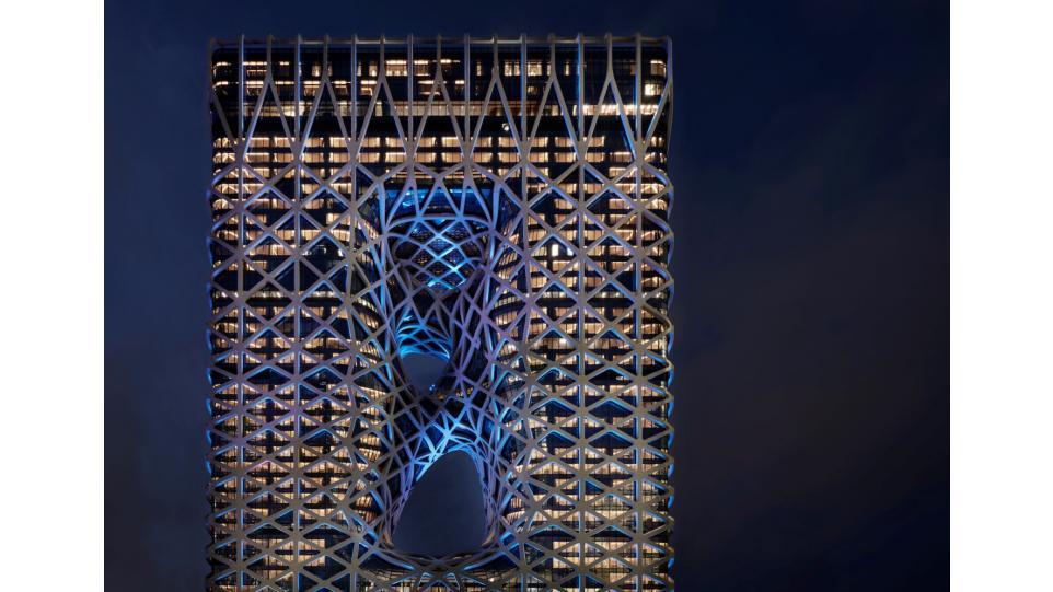 Фасад отеля оплетён сетчатой структурой, поддерживающей строение подобно экзоскелету. В этой сетке около 2500 модульных элементов и 1200 соединительных узлов.